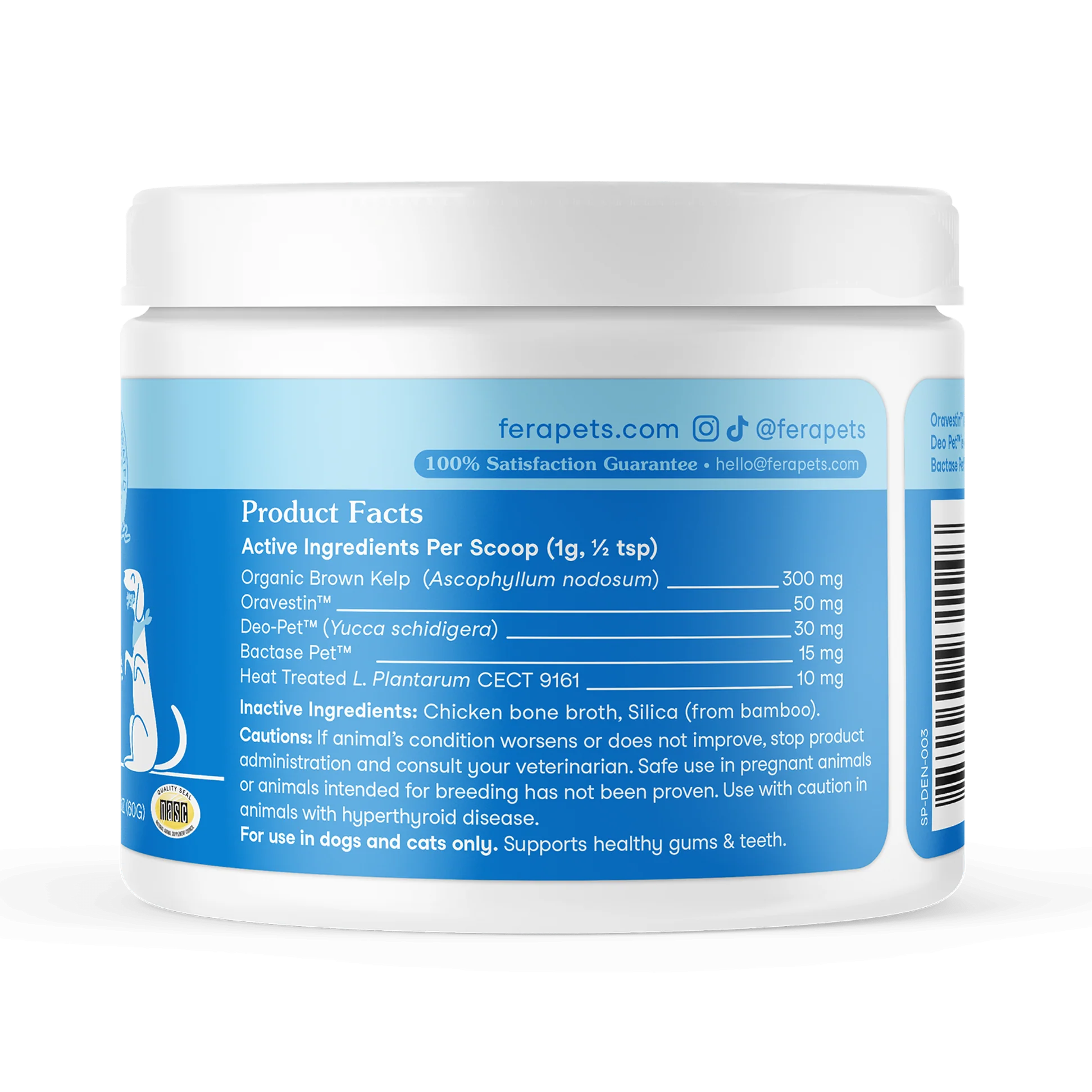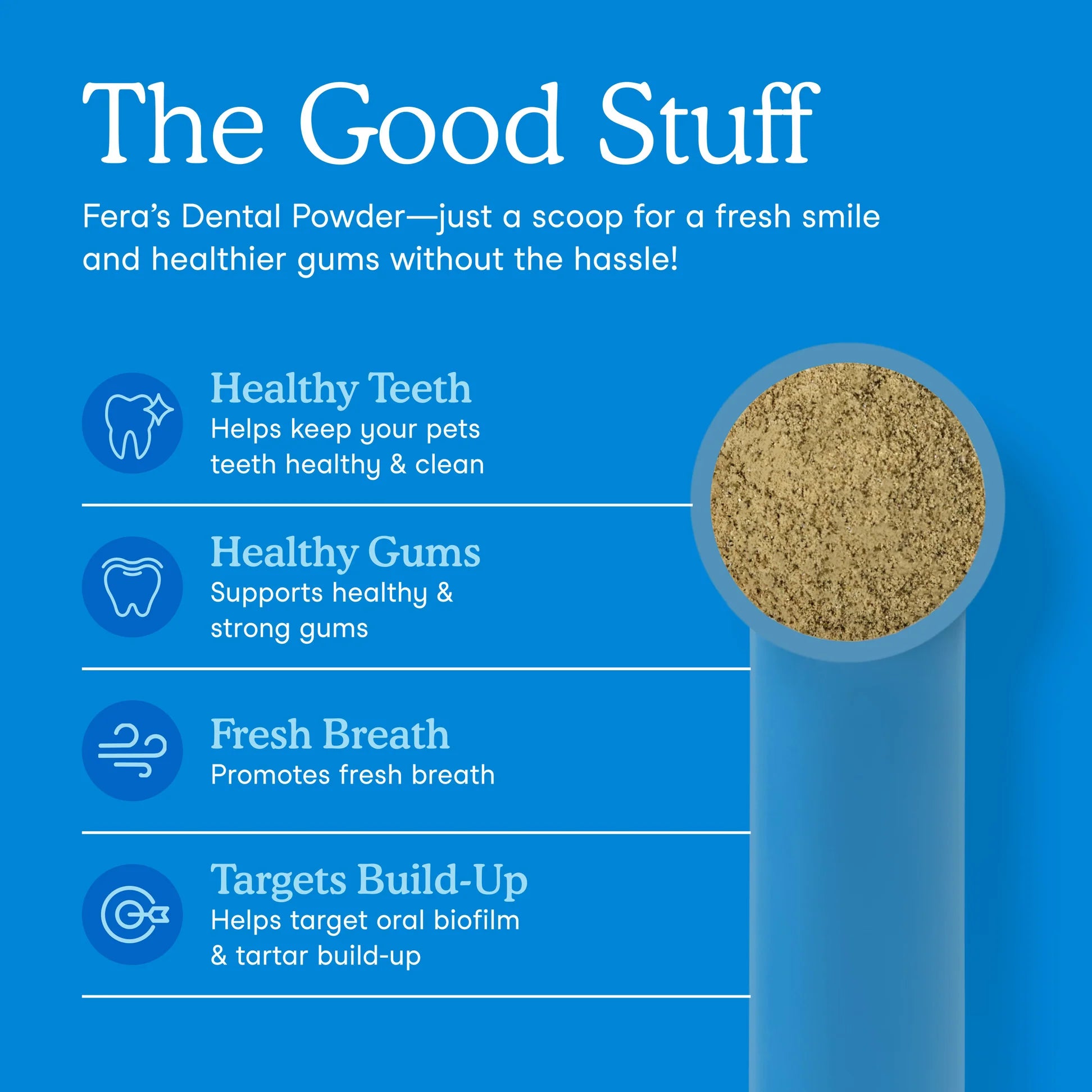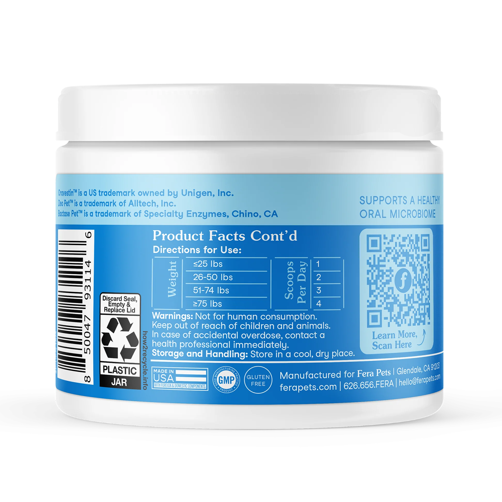 That’s why we created Fera Pet’s Dental Powder. In one small scoop you’ll find a specialized blend of botanicals, potent oral health-promoting enzymes and a clinically studied postbiotic specially blended together for that clean mouth feeling.