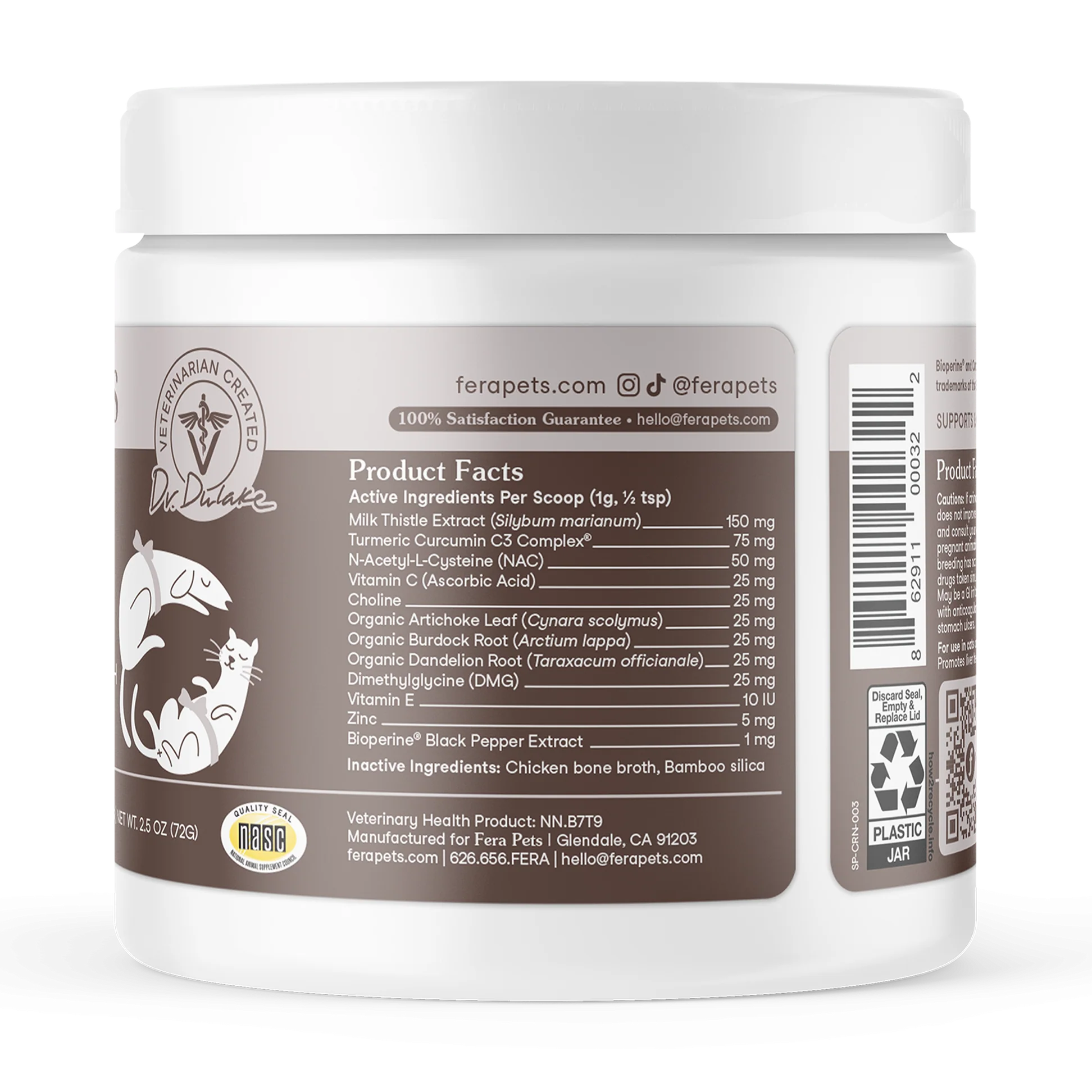 Our veterinarian-formulated Liver Support features Milk Thistle, which contains 80% Silymarin, an antioxidant which supports healthy liver health. It also includes Vitamin C, Vitamin E and Zinc to foster normal liver function, as well as Turmeric Curcumin, Burdock and Dandelion to support normal liver detoxification and healthy waste elimination. Also included is Choline, an essential nutrient for a healthy liver, heart and brain. This is the all-natural choice for dog liver support and cat liver support.