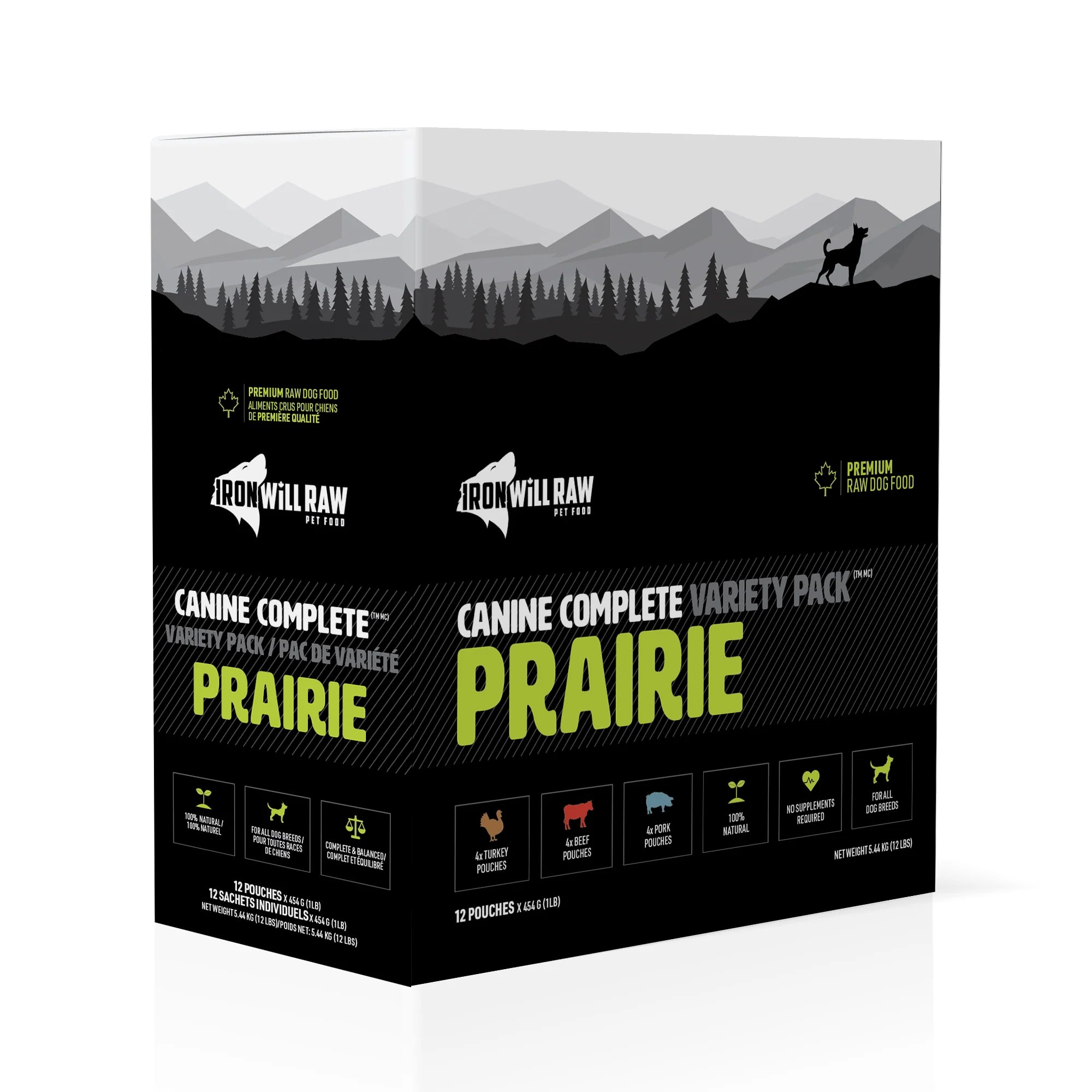 Each 12 lb Variety Pack offers a selection of THREE Canine Complete Dinner formulas. Our Variety Packs make raw feeding easy and convenient. Just grab your pet's favourite combination and you're all set!The Prairie Variety Pack will let you spoil your pet with this delicious protein rotation. Worry less about what you're feeding and spend more time doing the things you love with your pet!Iron WiIl Raw Canine Complete Dinners for Dogs are formulated to meet the AAFCO Dog Food Nutrient profile for Adult Maintenance.Case Includes:✓ 4x Canine Complete Turkey & Beef Dinner✓ 4x Canine Complete Beef Dinner✓ 4x Canine Complete Pork Dinner