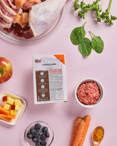 Ingredients: Turkey, Duck, and Chicken, Liver, Gizzard, Hearts (Turkey, Duck, Chicken), Carrots, Parsley, Apples, Blueberries.