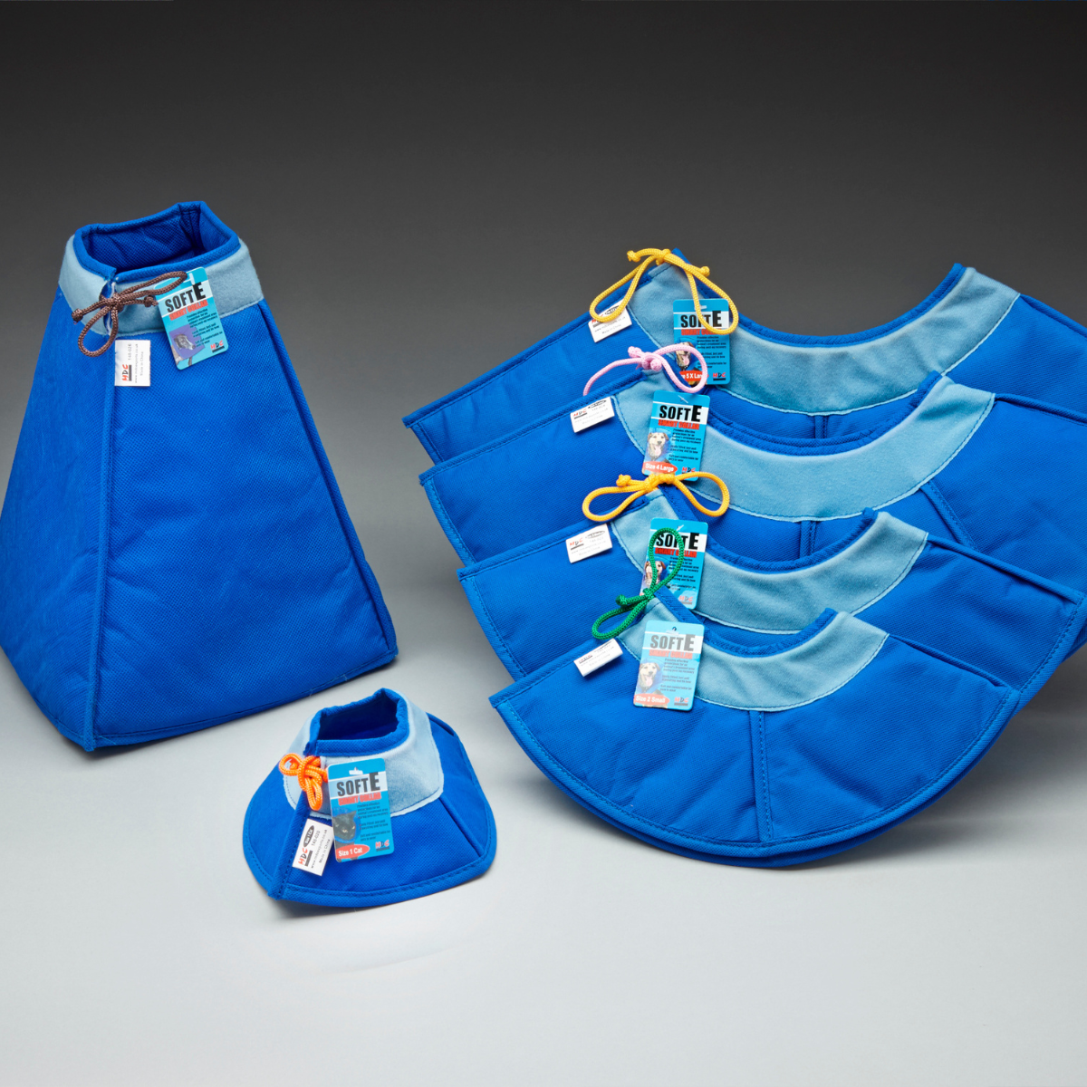 An Elizabethan collar designed for cats, dogs, and small animals in soft but durable fabric. Unlike other collars, the SoftE absorbs noise making it very well tolerated.