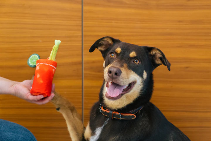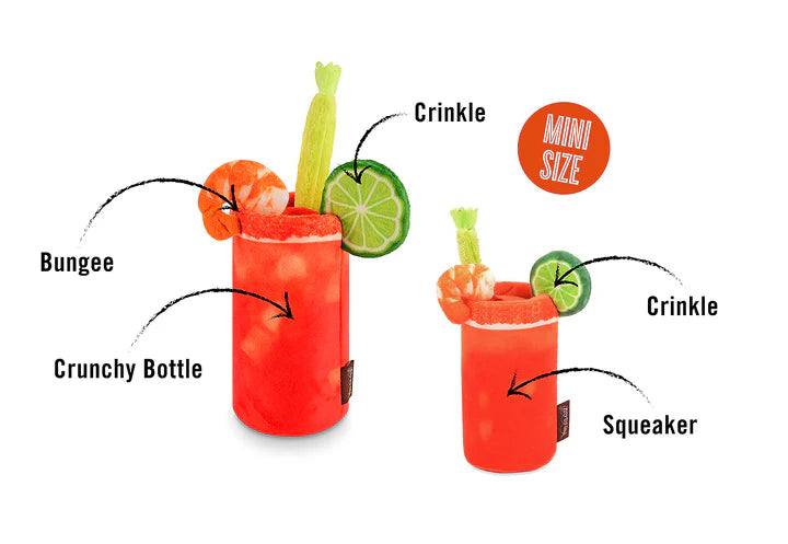 Looking for a fun way to treat your furry friend? P.L.A.Y.'s Barking Brunch Buddy Mary toy brings the flavors of brunch to playtime! It features a crunchy bottle in the body for interactive fun, crinkle fabric in the lime slice for added texture and a shrimp hanging on the side attached by a bungee for a playful twist. The mini version features crinkle fabric and a squeaker, offering just as much fun for smaller pups! Perfect for lazy days with your pup, this toy guarantees extra playtime joy.!
