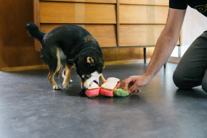Make playtime deliciously exciting with the Earth Rated x P.L.A.Y. Mon-treat-al Smoked Meat Sandwich! This toy features crinkly sandwich slices and a squeaky pickle, all strung on a sturdy t-shirt rope, making it perfect for tugging and chomping.