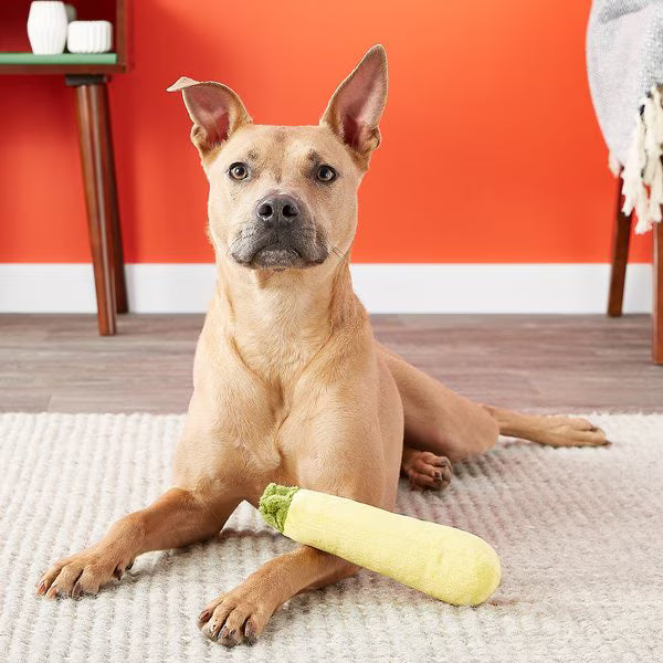 Who says veggies can’t be fun? P.L.A.Y.'s Garden Fresh Zucchini dog toy is available in two sizes, each filled with squeakers to keep your pup entertained for hours. It’s the perfect choice for pups who love to “veg” out with a little squeaky action. Whether it's a small or large dog, the zucchini's soft texture and playful squeak will have them wagging their tails all day!