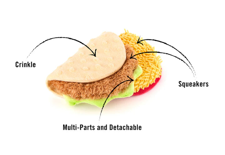 Spice up playtime with the P.L.A.Y.’s Tail Waggin' Taco toy. This fiesta of fun features detachable parts—a crinkly shell that comes off, and squeaky meat and cheese that completely come apart. Perfect for dogs who love to taco ‘bout dismantling their toys, this toy offers endless hours of crinkling and squeaking fun. It’s nacho ordinary toy, and it’s sure to be a favorite at every playtime!